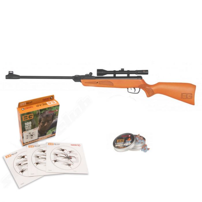 It features a Bear Grylls 4.5mm Young Explorer Air Rifle complete with a 4x28mm scope, 50x Bear Grylls Spider Paper targets and 150 Bear Grylls pellets. It will provide hours or fun and great practice for the new hunter.